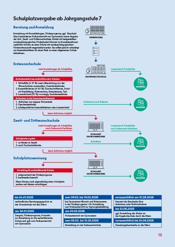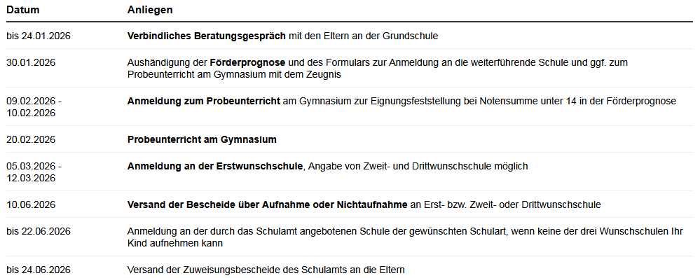 - Der Anmeldezeitraum für den Übergang in die Jahrgangsstufe 7 an weiterführenden Schulen ist vom 5. bis 12. März 2026. In dieser Zeit melden die Eltern ihr Kind in der Erstwunschschule an. Sie können auch einen Zweit- und Drittwunsch angeben.
